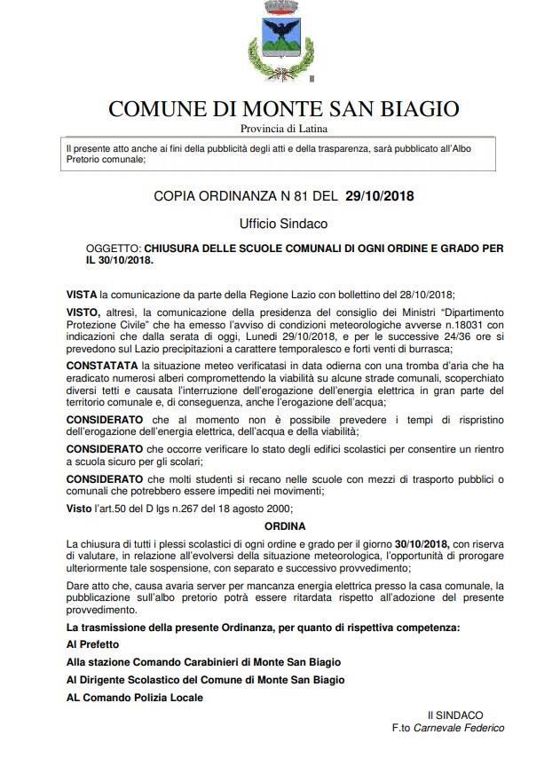 Su disposizione del Sindaco, domani 30 ottobre 2018, tutti i plessi scolastici siti nel Comune di Monte San Biagio rimarranno chiusi.